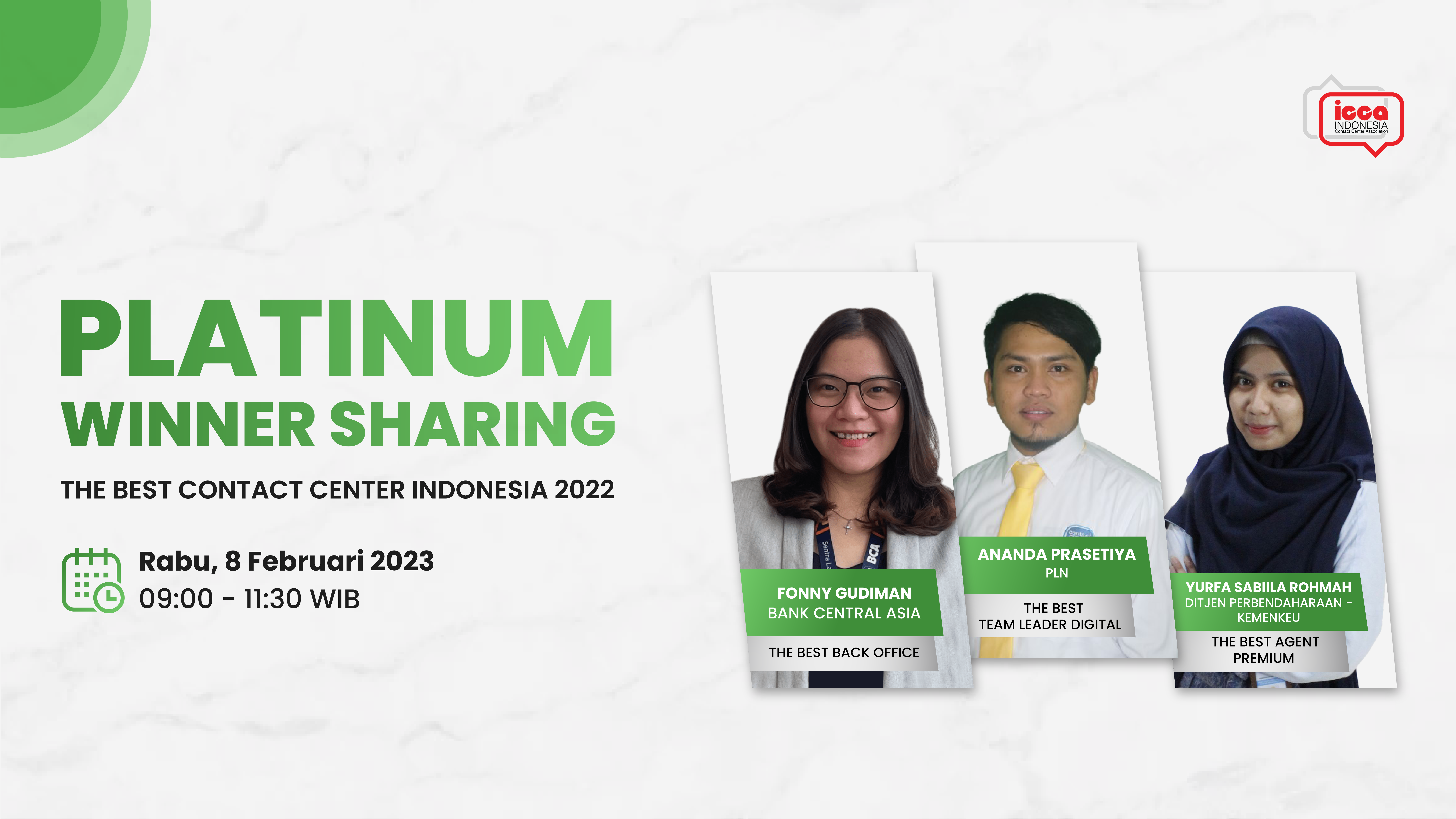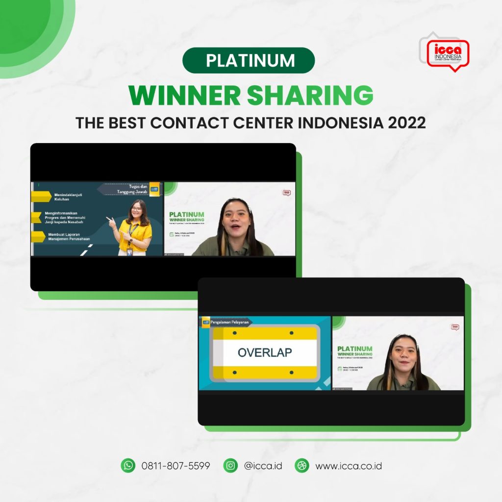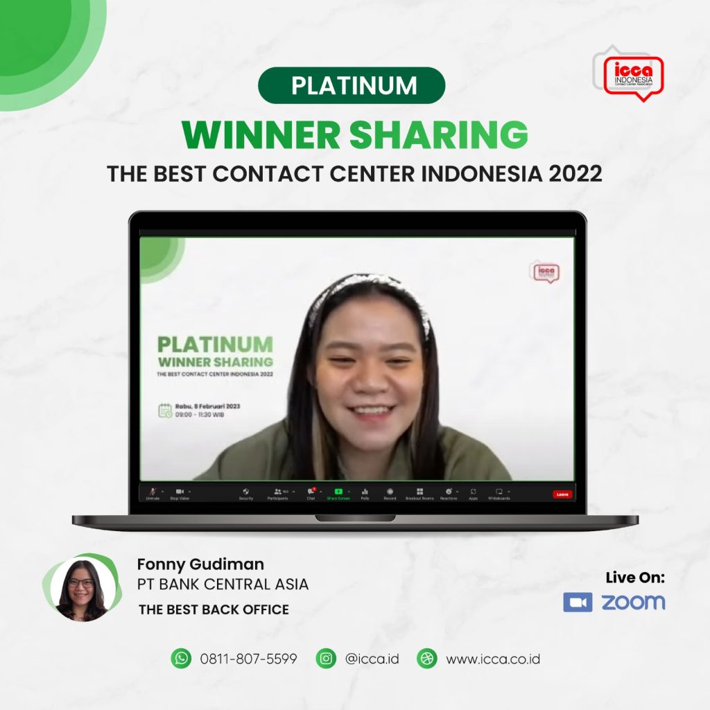 Winner Sharing kedua di bulan Februari kembali diadakan oleh ICCA dengan menghadirkan tiga pemenang Platinum TBCCI 2022. Pembicara pertama, yaitu Fonny Gudiman dari PT Bank Central Asia, Tbk, pemenang Platinum The Best Back Office. Menindaklanjuti keluhan yang tidak terselesaikan oleh frontliner merupakan salah satu tugas utama yang Fonny lakukan sebagai seorang Back Office. Dalam kesempatan ini, Ia juga membagikan beberapa tugas lainnya, seperti menginformasikan progres dan memenuhi janji nasabah, serta membuat laporan manajemen perusahaan.