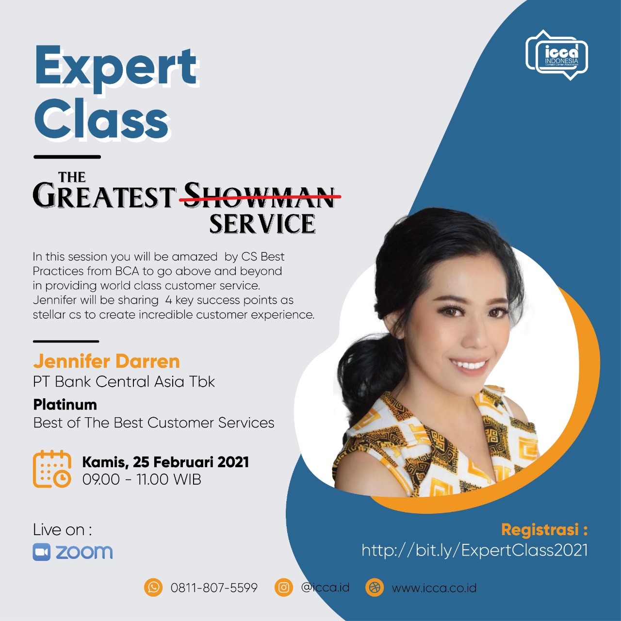 Expert Class kali ini membawakan topik The Greatest Service dimana Jennifer akan membagikan kunci sukses menjadi Customer Service dengan pelayanan berkelas dunia.
