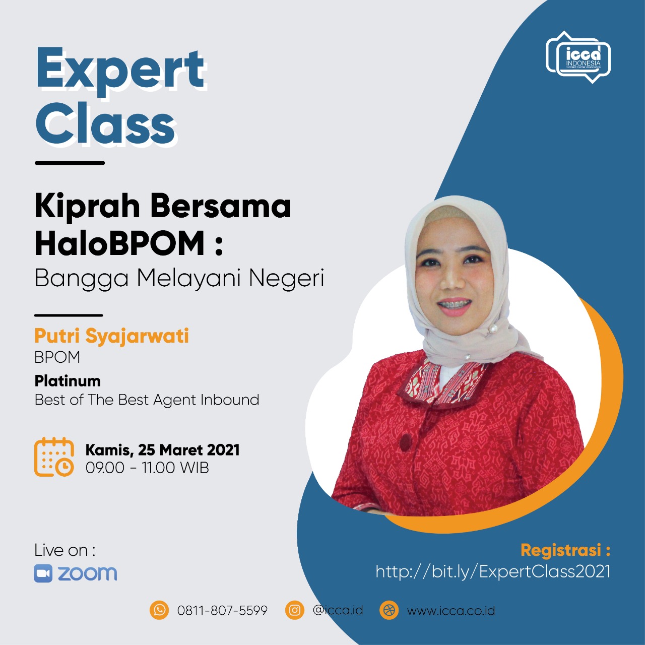 Kamis, 25 Maret 2021, acara Expert Class ke-6 di tahun 2021 telah diselenggarakan dengan mengundang Putri Syajarwati dari BPOM, selaku pemenang Platinum Best of The Best Agent Inbound TBCCI 2020, sebagai pembicara pada acara kali ini.