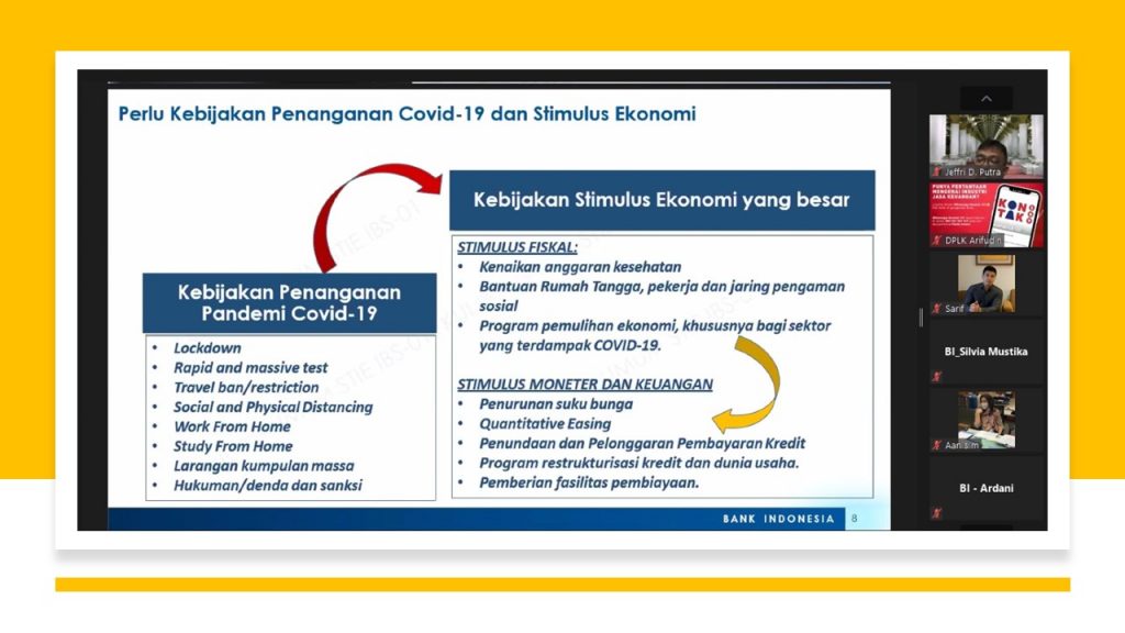Adanya berbagai hal tersebut, Bapak Onny Widjanarko memberikan pemahaman konsep dan strategi kebijakan Bank Indonesia dan Sinergi Kebijakan Nasional dalam menjaga stabilitas dan pemulihan ekonomi dari pandemik Covid-19. Beliau juga menyampaikan hal apa yang dapat dilakukan terkait adanya pandemik Covid-19 ini seperti pilihan untuk terus bekerja dengan baik di masa Pandemik ini. Peserta juga harus berfokus pada pemulihan kesehatan karena apabila kesehatan sudah dapat tertangani maka ekonomi nantinya akan mengikuti.