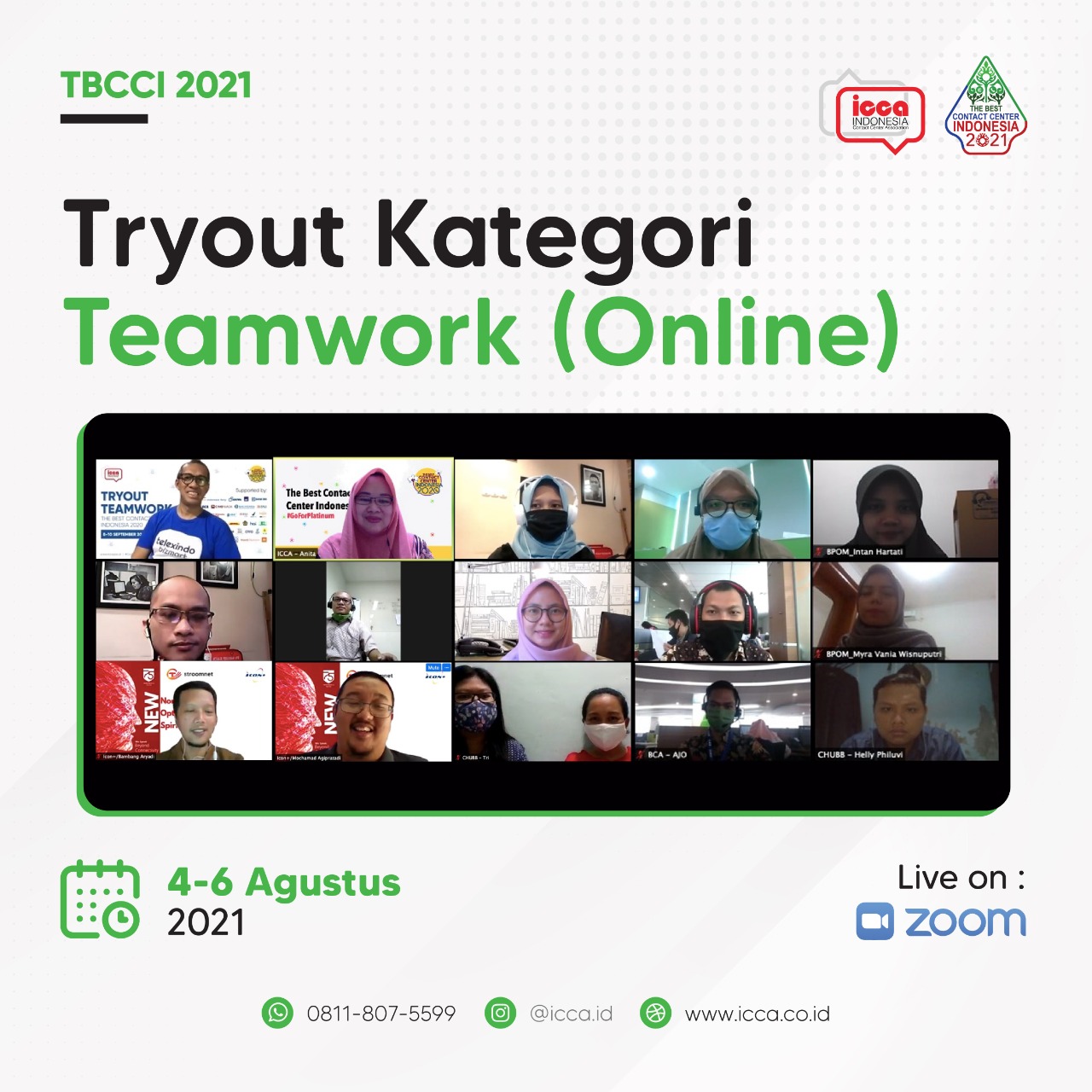 Pada perlombaan The Best Contact Center Indonesia 2021, para peserta kategori Teamwork akan diberikan akses untuk masuk ke aplikasi yang telah dibuat oleh tim ICCA. Selain itu, perlombaan ini juga akan diawasi melalui zoom oleh panitia. Setiap tim akan diberikan breakout room di dalam aplikasi Zoom agar lebih mudah melakukan koordinasi dan interaksi sesama teman satu timnya.