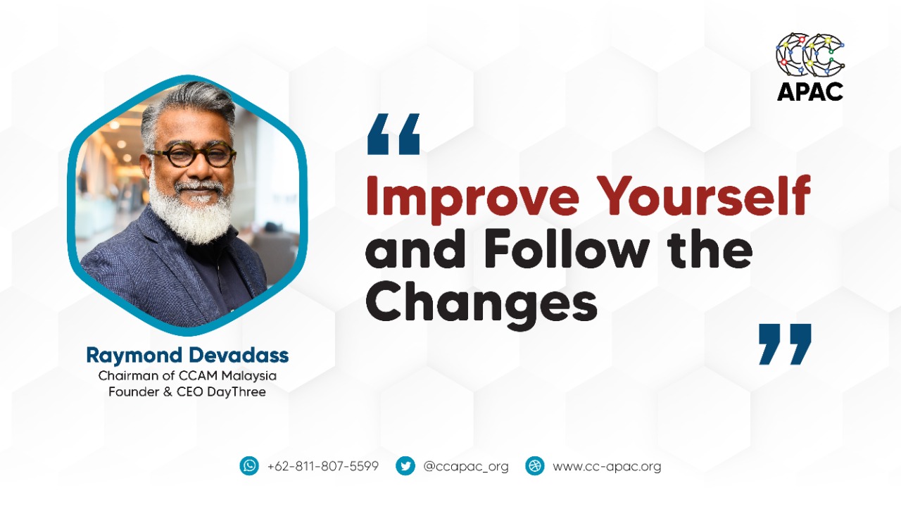 Salah satu pembicara adalah Raymond Devadass, Chairman of CCAM Malaysia, Founder & CEO Day Three. Raymond menjelaskan bahwa gameplay saat ini adalah bermain untuk perubahan. Dalam industri contact center, perubahan bukanlah hal baru. Mereka menerima dan mengalami banyak perubahan, seperti halnya internet. Kami beralih ke mobile karena semua kaum milenial saat ini menggunakan ponsel mereka untuk menjangkau media sosial dan hal-hal lain seperti itu. Kemudian industri contact center juga telah melalui dan mengikuti perubahan ini dengan sangat cepat dan pesat.