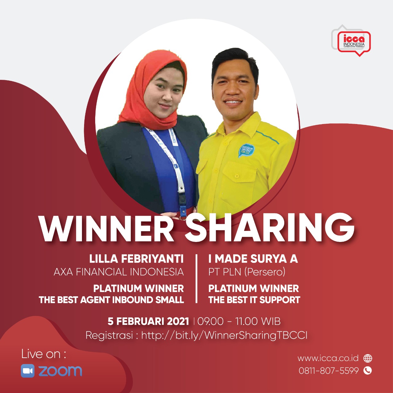 Jumat, 05 Februari 2021, ICCA kembali mengadakan Winner Sharing 2021 yang kelima. Pada kesempatan ini, kami mengundang dua pemenang platinum pada The Best Contact Center Indonesia 2020 yaitu Lilla Febriyanti dari AXA Financial Indonesia dari kategori Agent Inbound Small dan I Made Surya Andhana dari PT PLN (Persero) dari kategori IT Support.