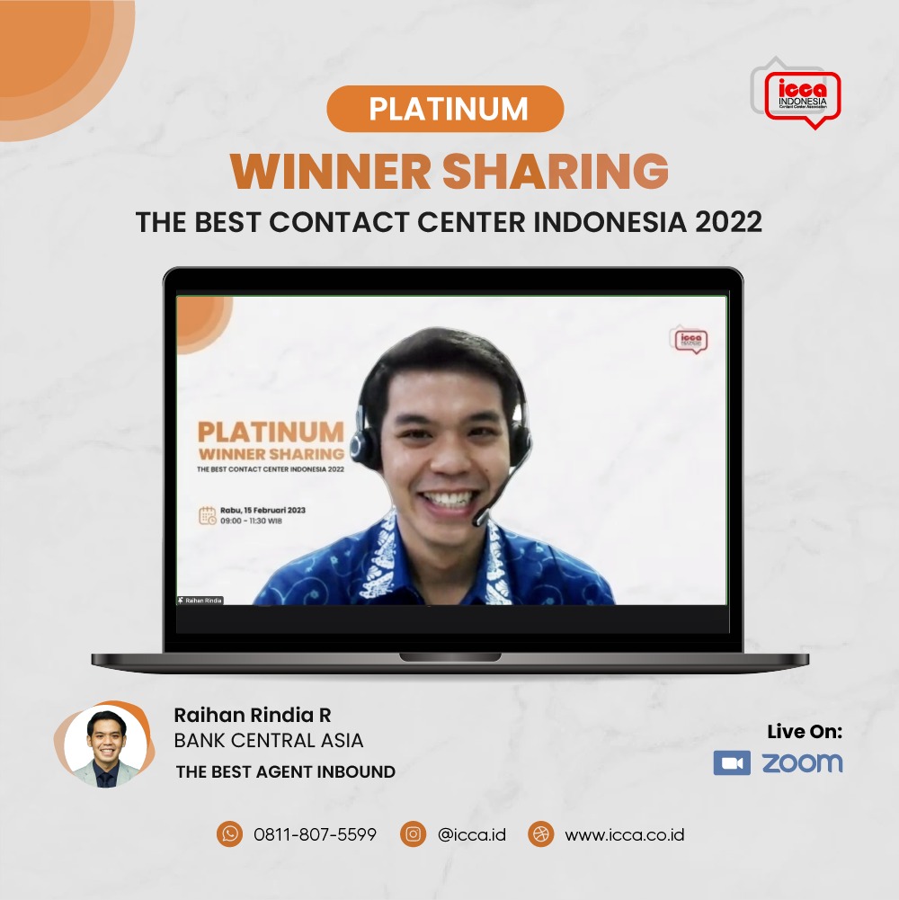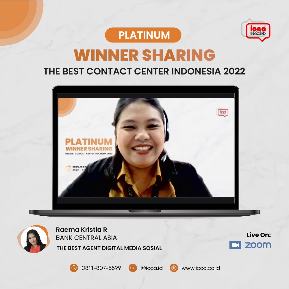 Winner Sharing ketiga di bulan Februari kembali diadakan oleh ICCA dengan menghadirkan tiga pemenang Platinum TBCCI 2022. Pembicara pertama dari Bank Central Asia, Tbk yaitu Raema Kristia Rinjani. Perempuan yang akrab dipanggil Rae ini merupakan pemenang Platinum The Best Agent Digital TBCCI 2022. Rae menyampaikan bahwa ia kini bertanggungjawab menjadi seorang Agent Social Media di Halo BCA khususnya pada platform Twitter.