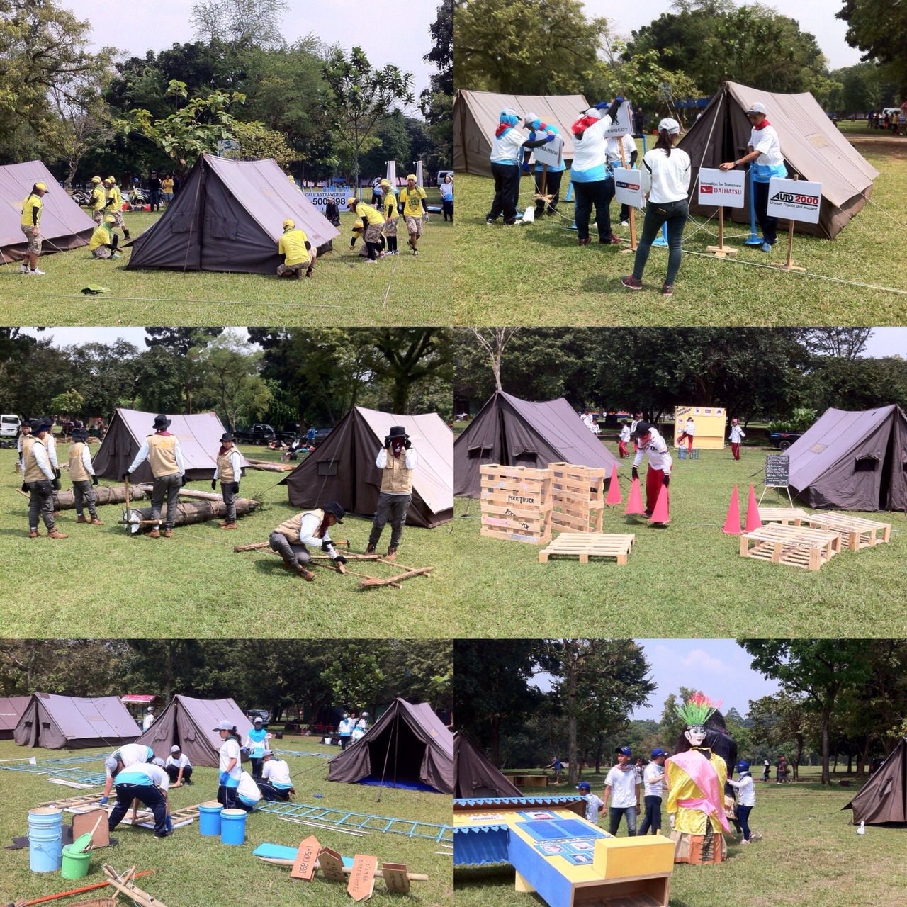 Penilaian pertama dimulai dengan perlombaan membangun tenda dengan baik, kokoh dan tepat waktu. Panitia menyampaikan rule sebelum dimulainya penilaian yaitu; tenda harus dibangun oleh peserta inti dan tidak boleh dibantu oleh siapapun, ikatan harus kuat dan waktu yang diberikan harus sesuai. Semua peserta yang dikirimkan adalah perwakilan yang sangat kreatif dan handal, lihat saja.. semua peserta saling bekerja sama dengan teamnya masing – masing. Untuk memacuu semangatt, kami dengar yel yel yang mengalun dari tiap team sebelum mendirikan tenda “Satu dua huh.. satu dua huhh.. satu dua huhh” itu yang salah satunya kami dengar dari Pajak. Team lain tidak kalah dong… Panin, Bank Mandiri, Astra World, BCA, Indosat dan Kereta Api Indonesia. Memang sepertinya terlihat lelah, namun jika dikerjakan bersama akan terasa mudan dan ringan, seperti pepatah lama bilang “Adalah sebuah lidi, jika hanya satu batang hanya akan berguna sebagai tusuk gigi namun apabila disatukan menjadi kesatuan utuh maka akan berguna sebagai sapu lidi” seperti itulah team yang solid.