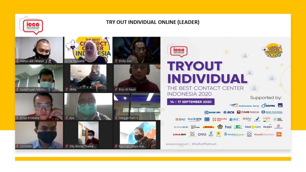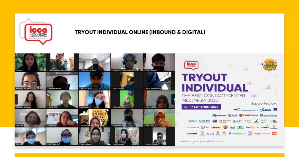Setelah Tryout Teamwork Online dilaksanakan pada 8 – 10 September 2020, rangkaian ajang The Best Contact Center Indonesia 2020 dilanjutkan dengan Tryout Individual Online. Diselenggarakan selama 4 hari berturut-turut pada 14 – 17 September 2020, Tryout Individual Online ini dipandu langsung oleh Andi Anugrah selaku ketua ICCA didampingi oleh Anita Rizqiana sebagai salah satu pengurus ICCA.